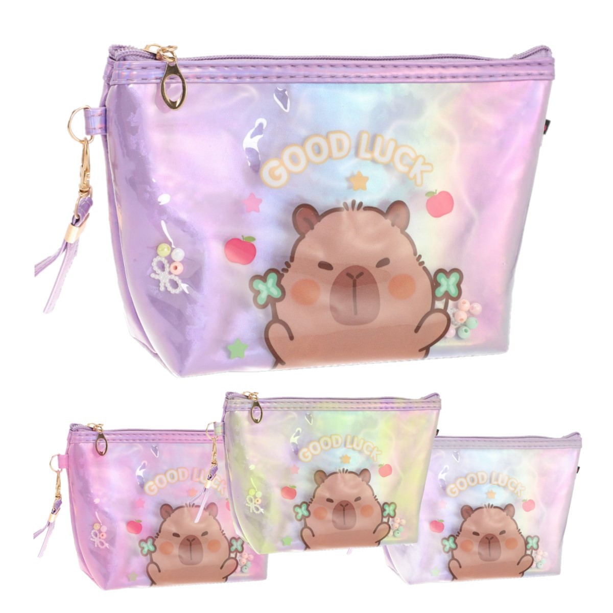Uma escolha perfeita pra você que é apaixonado por capivara. Agora pra completar o Kit temático deste animal fofinho, a Cisne lançou a necessaire com tema de capivara e um acabamento decorativo em poliéster.