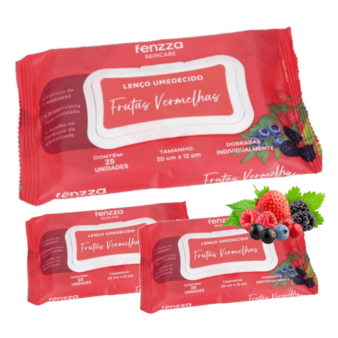 Mantenha sua pele limpa, radiante e livre de oleosidade com os Lenços Umedecidos de Frutas Vermelhas da Fenzza.