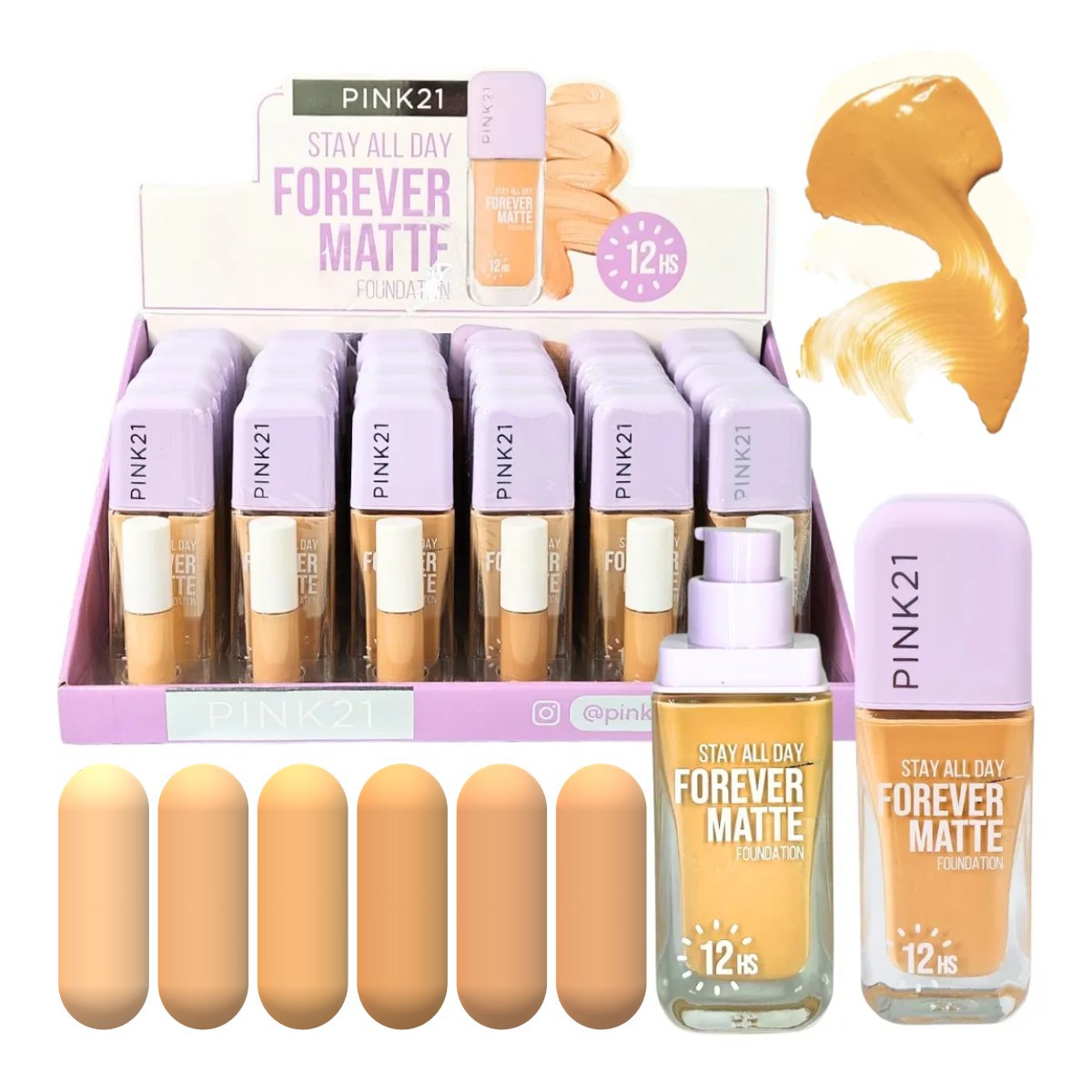 A Base Forever Matte da Pink 21 tem textura cremosa, cobertura média e aceita camadas.