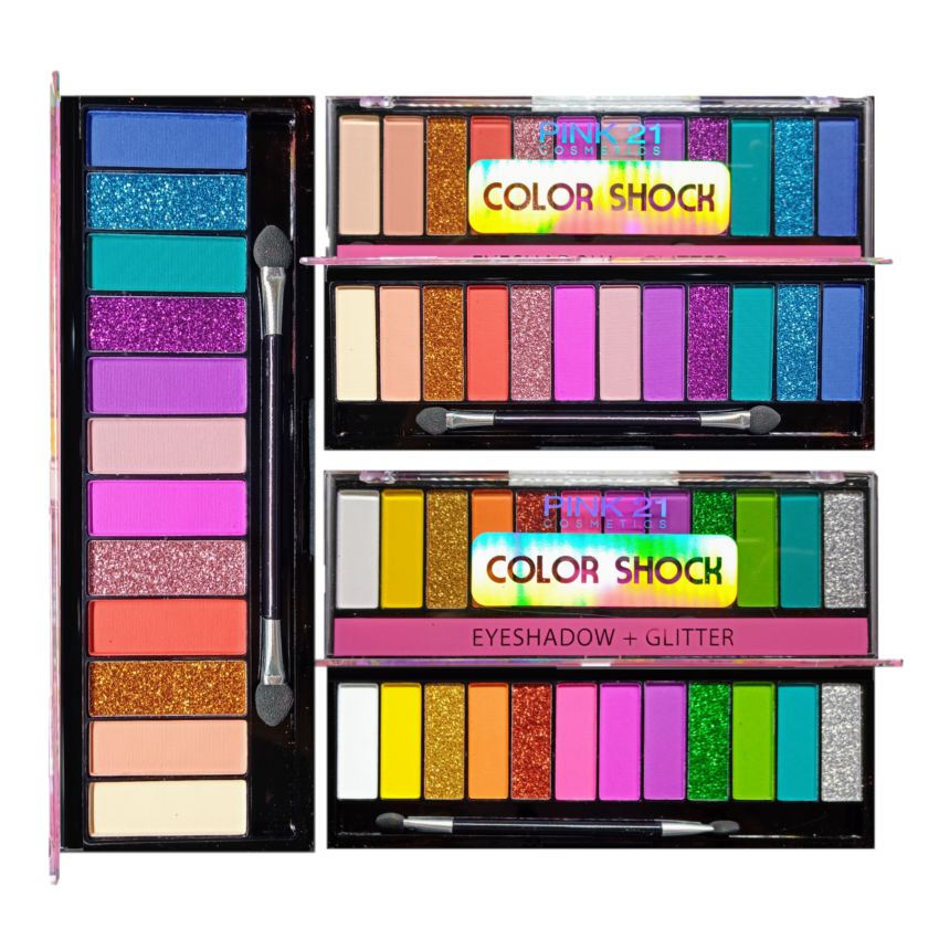 Pra você que gosta de muito brilho, chegou a Paleta de Sombras Color Shock da Pink 21, a paleta é composta por 12 tons de sombra sendo 4 de glitter prensado o