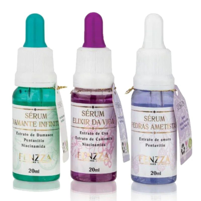 - O Sérum Elixir da Vida Fenzza Make Up, auxilia na hidratação e revitalização facial. Os principais ativos são: Extrato de Uva e Extrato de Camomila que promovem uma ação calmante, hidratação, maciez, limpeza e tonificação da pele. A Niacinamida é um excelente redutor de manchas que vai trazer uma maior uniformização da sua pele