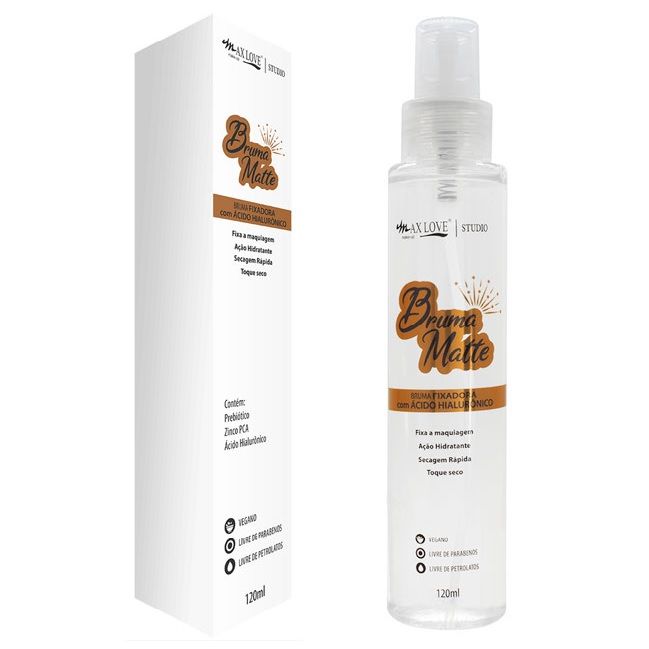 A Bruma fixadora Matte da Max Love possui efeito matte, acido hialuronico, ação hidratante, Secagem rapida e toque seco. Possui prebiótico, Zinco PCa e Acido Hialuronico